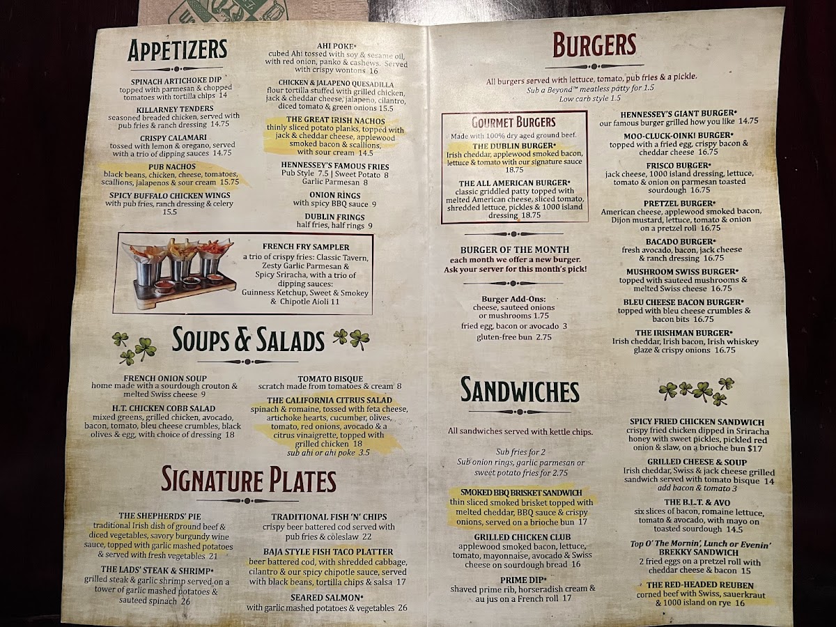 Cuisine Type: Hennessey's Tavern specializes in comforting Irish fare that’s sure to satisfy your cravings. You can expect to indulge in hearty dishes like their flavorful Irish Nachos and classic Fish and Chips, both proudly celebrated in customer reviews for their quality and taste. The Brisket Sandwich has also garnered praise for its rich flavor profile. For a sweet finish, don't skip the Captain Crunch French Toast dessert, described as "sooo freaking flavorful," making it a memorable treat that visitors rave about.